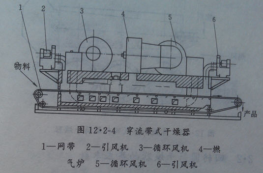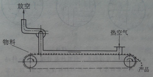 物料放在多孔板或金属丝网制成的水平输送带上,热风穿过物料层进行干燥,称为穿流带式干燥器,如下图所示。它有向下通风型和向上通风型,也有复合通风型。对于泥状物料,可适当成形后进行干燥,也有将成型机与干燥器联合使用的,以改善干燥物料的均匀性,防止粉尘飞扬。带的侧面及装置出入口处的密封应特别注意,否则会产生漏气,造成短路,使干燥速率大大降低。物料层的厚度须均一,不然也会造成气体短路,使产品质量下降。通常,料层厚度视物料状态由实验确定。一般带的正面通风速度为0.5~1.5m/s,也有达到2~3m/s的;干燥时间0.2~1.5h;干燥强度6~16.6kg(H2O)/(h.m2)。