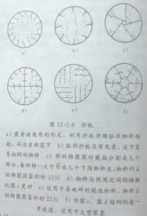 为了使物料分散均匀,热风与物料充分接触,直接加热式回转圆筒干燥器内装有抄板,抄板的型式各种各样,如图所示。有的回转圆筒前半部分用结构较简单的抄板,后半部分用结构较复杂的抄板。抄板个数与筒径为6~10个/m,抄板高度要保证其不至于被干燥器内的物料给埋起来,一般为筒径的1/12~1/8。