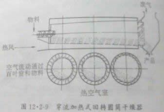 穿流加热式回转圆筒干燥器是在筒体内壁沿圆周方向等距离装有许多叶片,热风通过叶片的间隙吹进物料层内,并使之干燥。由于热风与物料充分接触进行传质传热,所以热效率较高,干燥时间短,干燥均匀。如下图所示。也有的将回转筒体沿长度方向分成几种独立的部分,每一部分均设有加热器、鼓风机等,能够各自独立调节。这样亦出现做到干燥和冷却在一个干燥器内完成。