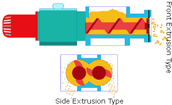 经混合、捏和的湿物料或低软化点(一般指小于60℃)物料,在螺杆输送过程所产生的挤压力作用下,被从机头模板开孔处挤出,形成条状;再经过干燥或冷却得到短柱状颗粒成品,从而实现将粉状产品改变为均匀的颗粒产品的目的。颗粒形状为圆柱状(或特殊异形截面),成品颗粒直径可由摸板开孔孔径调节和控制:侧出料为0.6-2.0mm,前出料为1.0-12mm。自然断裂长度取决于物料粘结强度,一般为直径的1.25-2,0倍范围内。对长度有特殊要求的前挤出型可采用外切粒的方式,这样可以得到相对均匀的颗粒成品。多数情况下成粒率≥95%。